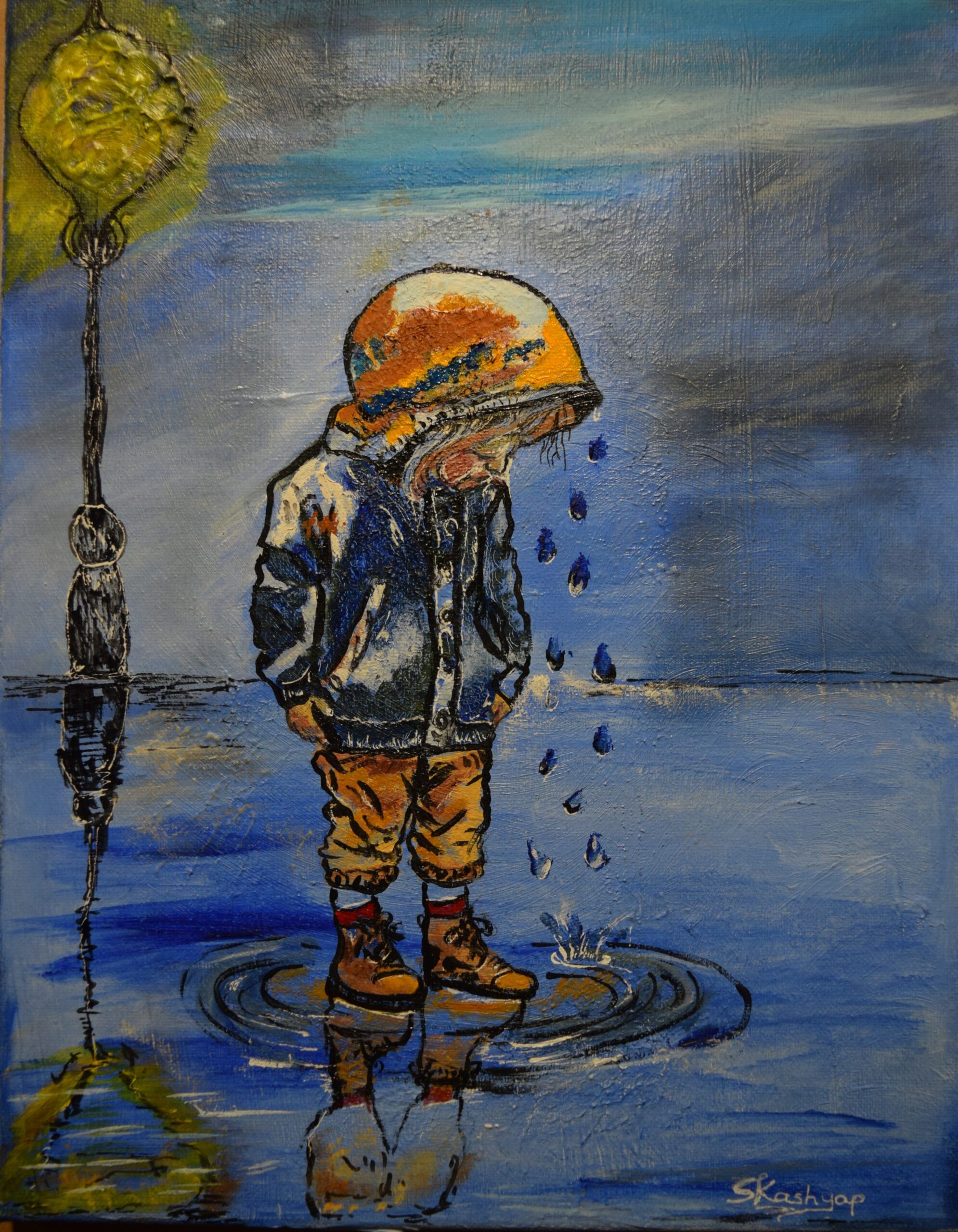 A rain-soaked kid with a balloon reflects innocence and resilience beneath the falling drops.